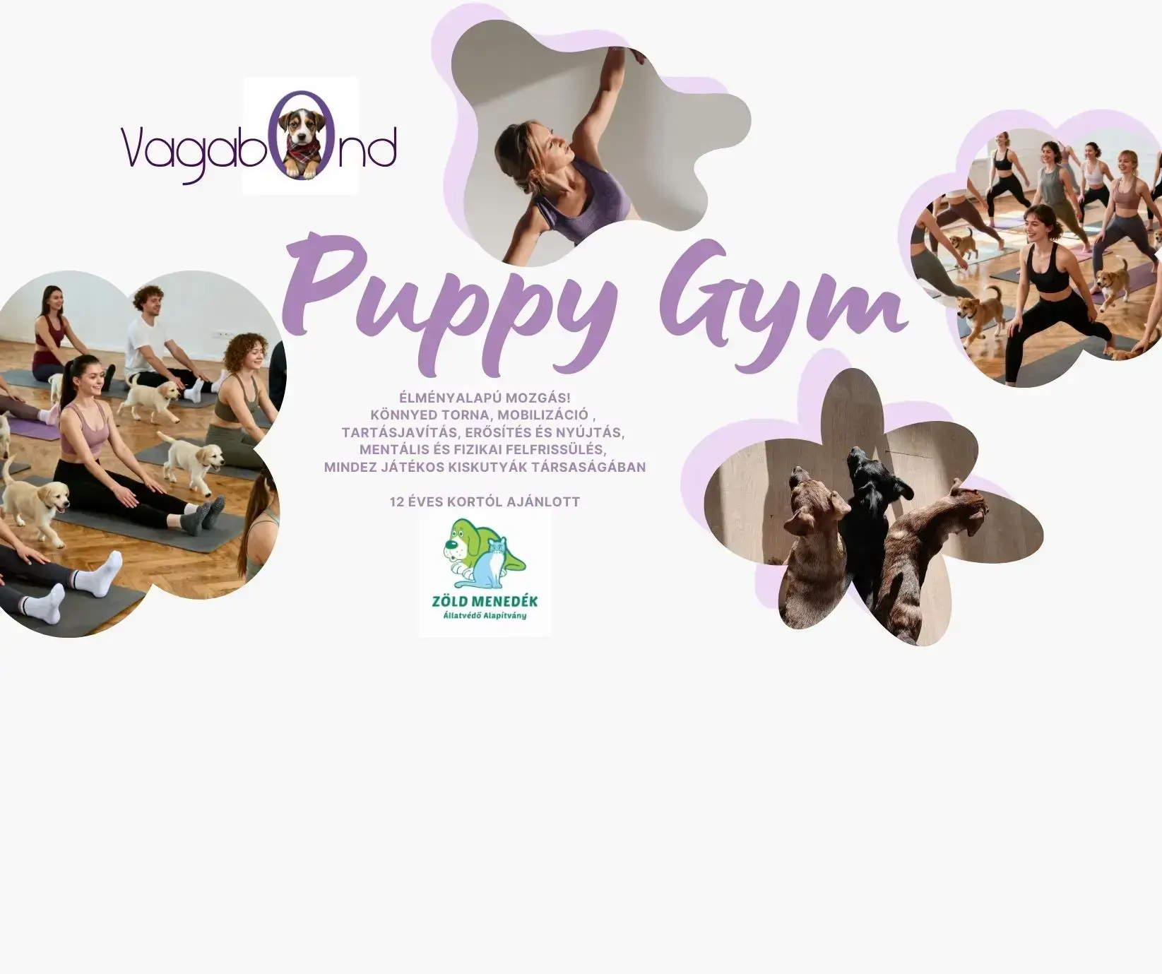 A Vagabond Puppy Gym egy élményalapú, könnyed mozgásóra, amelyet a nemzetközileg ismert puppy jóga inspirált, mégis szabadabb, felszabadítóbb mozgásnyelvet használ. Az órán a fókusz a core aktiválásán, a mobilitáson, a finom erősítésen és a regeneráción van, miközben a mozgás végig könnyű és élvezetes marad. Minden edzésen részt vesznek a Zöld Menedék Alapítvány örökbefogadható kölykei; a kutyák minimum 8 hetesek, féreghajtottak és rendelkeznek a kötelező oltásokkal. A kiskutyák az első per...