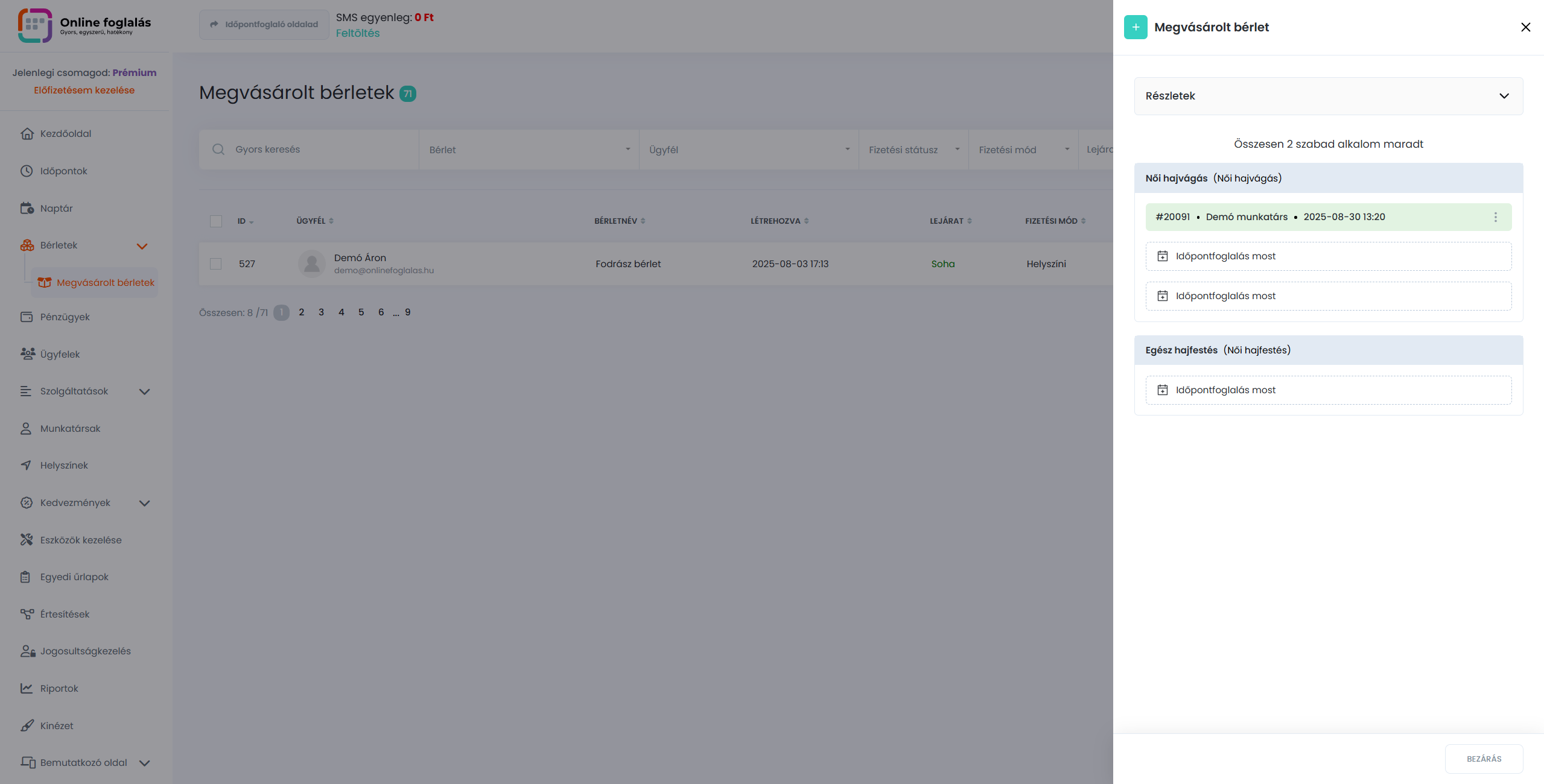 Nemcsak az ügyfelek, hanem te is foglalhatsz időpontokat a bérleteikhez. Ehhez használhatod a Megvásárolt bérletek menüpontot, ahol egy helyen láthatod az összes bérlet vásárlást. Itt lehetőséged van szerkeszteni őket, vagy akár te magad is létrehozhatsz időpontokat.